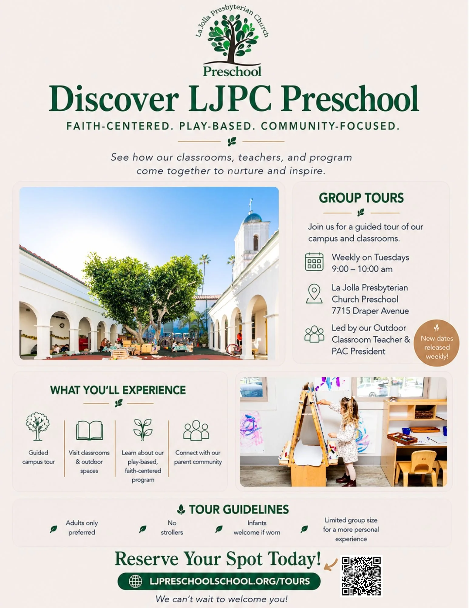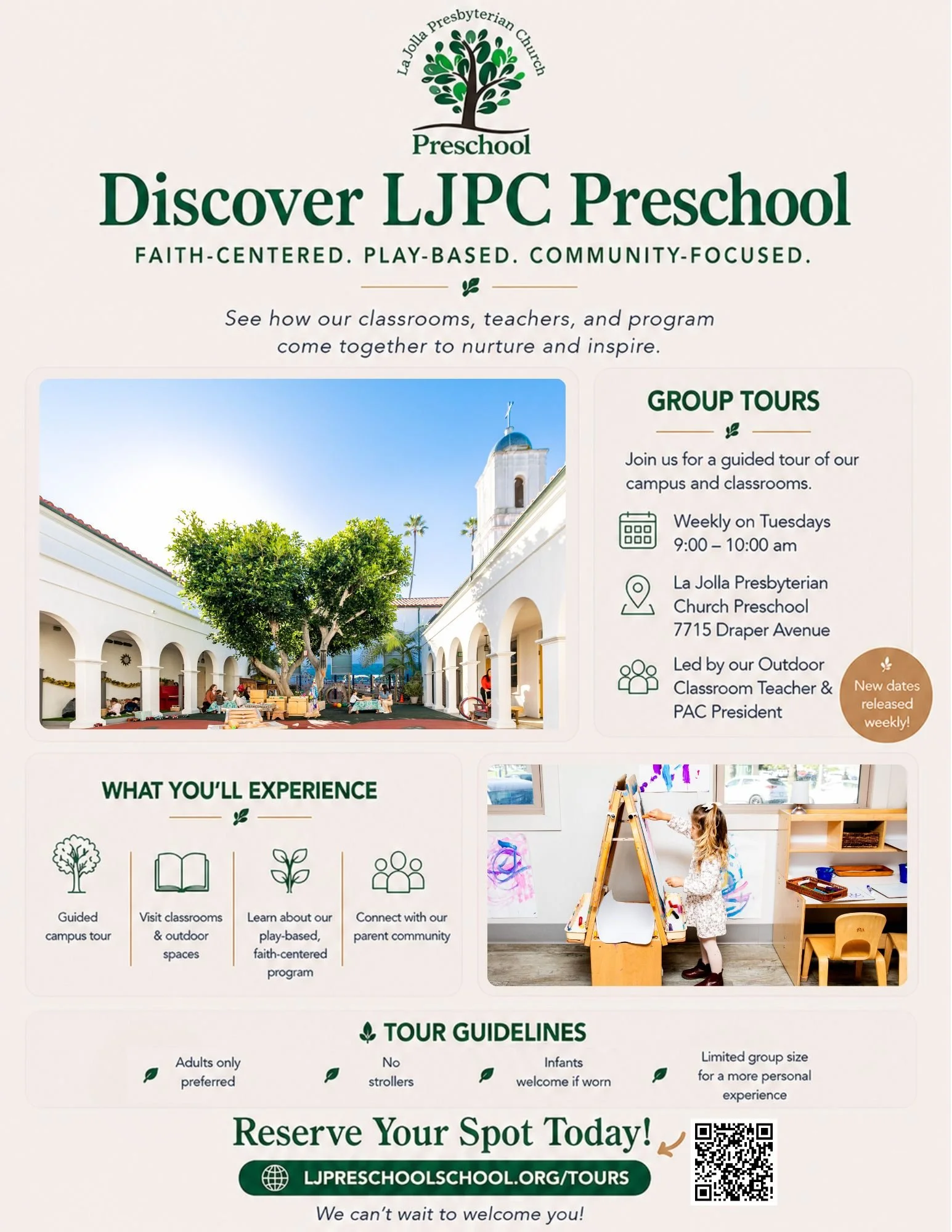 Our group tours are designed to give you a meaningful, authentic look at daily life at LJPC Preschool.